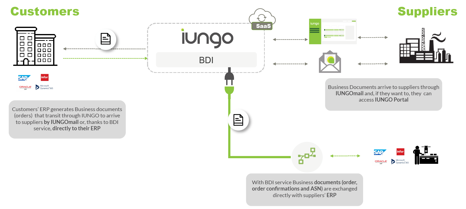 IUNGO does not make the connection between the BDI and the supplier’s ERP. The connector with BDI is the supplier’s responsibility.