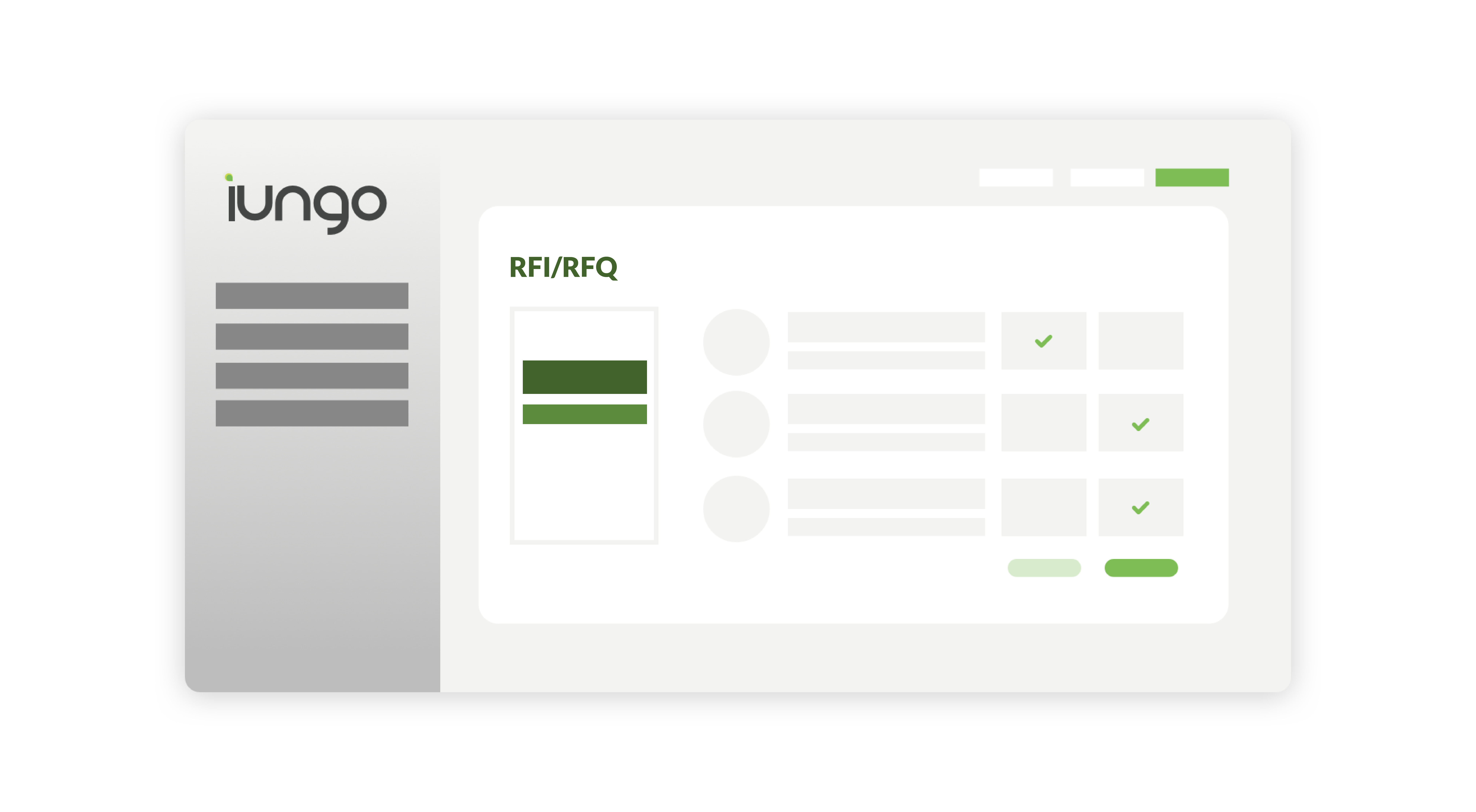 IUNGO helps you to digitize the Sourcing process phase, making it faster and more effective to search for alternative suppliers and requesting bids from a wider and more qualified panel of suppliers.