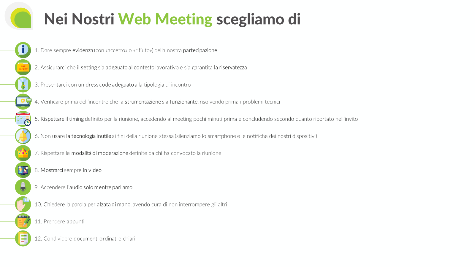 Uno degli elementi core della nostra formazione sul remote first è il nostro Codice di Condotta dedicato ai Web Meeting, che incarna la nostra dedizione a mantenere standard elevati di professionalità e collaborazione, indipendentemente dalla distanza.